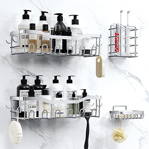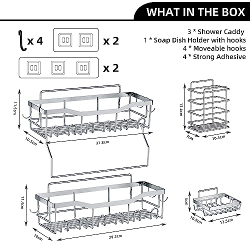 kitnice Bathroom Storage Shower Shelves Silvery, Shower Caddy(4 pack), No Drilling Mounted for Bathroom, Bathroom Accessories, Towel Hook Bathroom organiser,Razor Holder, Soap Dish With 15 Hooks