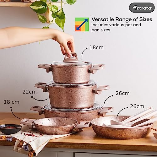 Karaca Organic granite rose gold 10-piece cookware set, induction, non-stick coating, pot pan set with glass lids, dishwasher safe, granite pot pan set, suitable for induction cookers