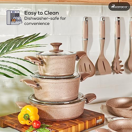 Karaca 13-Piece Cookware Set – Non-Stick & Induction Pots and Pans Set with Utensil Set, 3 Biogranite Pots with 3 Glass Lids&1 Granite Frying Pan&1 Shallow Pan, Dishwasher-Safe, Rosegold