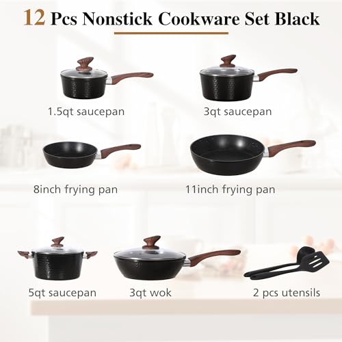 12 Piece Cookware Set: The pots and pans set includes 8-inch fry pan / 11-inch fry pan / 1.5Q saucepan with lid / 3Q wok with lid / 3Q casserole with lid / 5Q casserole with lid / 2 pcs silicone utensil set . This pots and pans set includes everything you need to outfit a kitchen for your cooking.