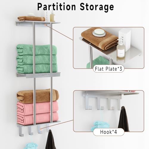 Towel Rack Wall Mounted, Bathroom Towel Storage with Shelf & 4 Hooks, 90CM Stainless Steel Wall Mounted Towel Holder, Brushed Nickel