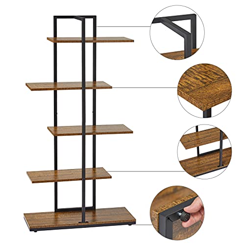 Mondeer Bookshelf, 5-Tier Floor Standing Bookcase, Asymmetrical Staggered Display Shelf, Plant Shelf, Industrial Style, for Living Room, Bedroom, Home Office, 74 x 28 x 144.5 cm, Rustic Brown