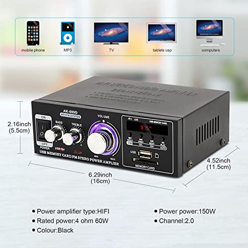 COMPACT AND POWERFUL: Mini Amplifier This machine has a USB interface System for Wireless Audio Streaming, Offers Stable High-Quality Connection. Support 2 channel surround stereo sound, Equipped with a mini remote control, more convenient to remotely control the machine at any angle.