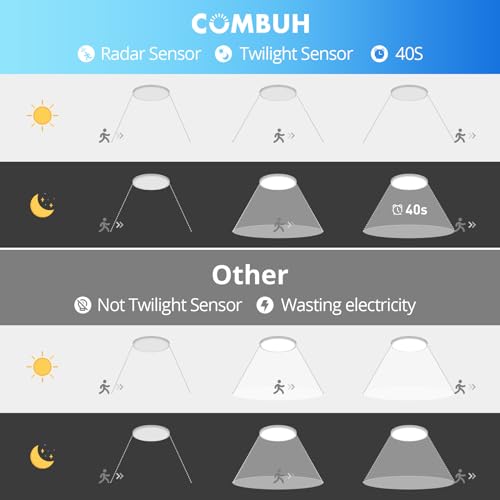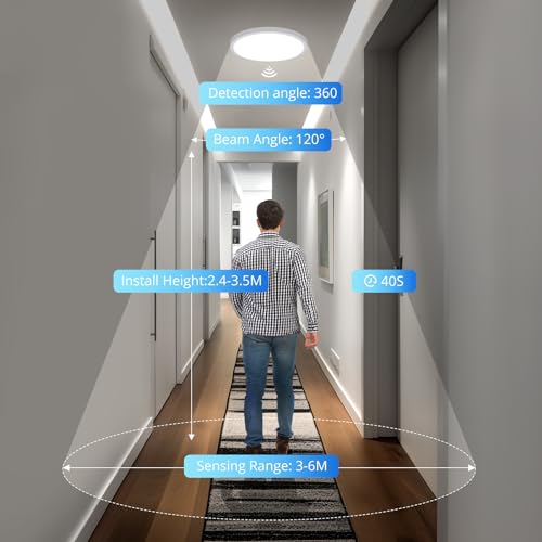 💡💡Intelligent radar induction: Our motion ceiling Light uses advanced radar sensor technology to precisely detect movements in the room. It lights up automatically when motion is detected within 3-6 meters. 40s after the person leaves, the round ceiling light turns off automatically. Radar detectors are inactive during the day.