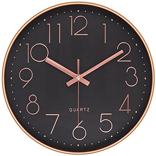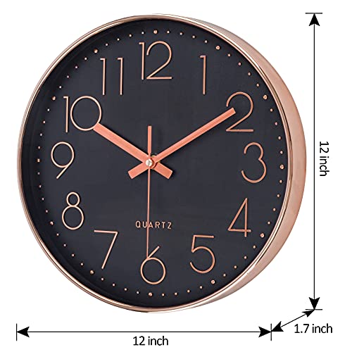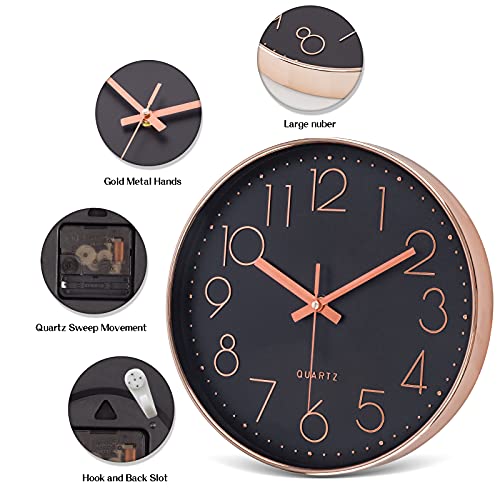 LENAUQ Silent Wall Clock, 12 Inch Battery Operated Non-ticking Arabic Numeral Clock, Round Decorative Clock for Home Kitchen Cafe Hotel Office Decor(Black-Rose Gold)