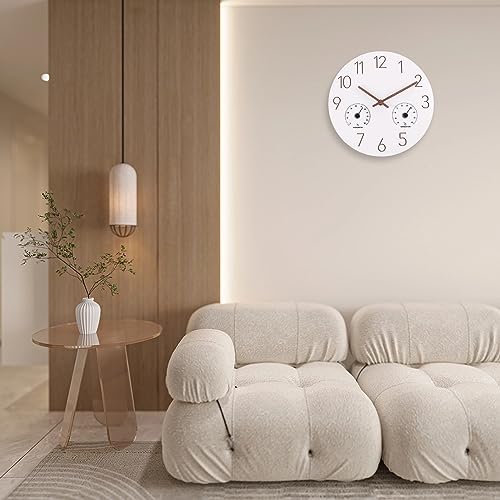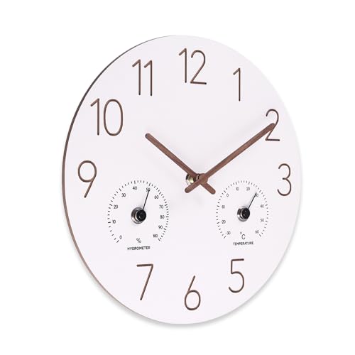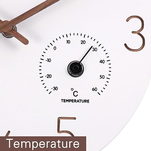 Simple and Elegant Design: White wooden MDF clock face with beautiful engraved numbers and wooden hour and minute hands add a touch of elegant flair to your home. The temperature and humidity are extra bonus.