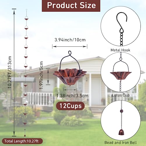 Qipade 10FT Lotus Rain Chain, Rain Chains for Gutters with 12 Cups, Adjustable Rain Catcher Chain with Bell for Eaves Drainage, Replacement for Downspout