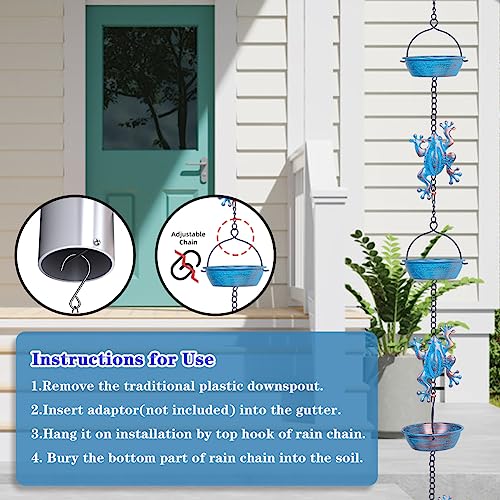 🐸 [Stylish Design] The rain catcher chain is blue and golden, consisting of 11 cute frogs and 12 cups. You can enjoy the amazing scene of rain flowing down the rainchains, without worrying about it splashing everywhere, because of the design of the wide cup.