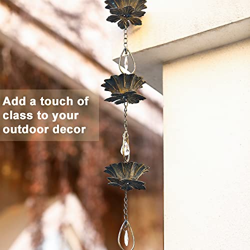 This rain chain features beautiful leaf-shaped frames, intricately acrylic pendants, flowers-shaped bowl