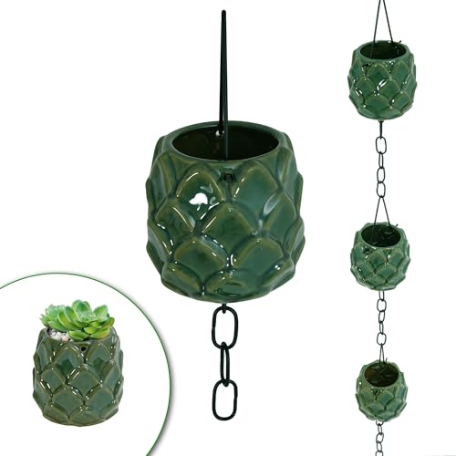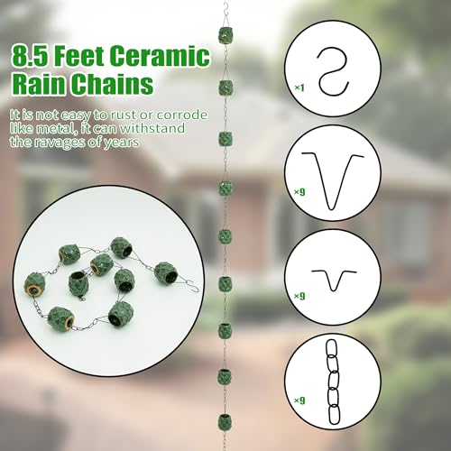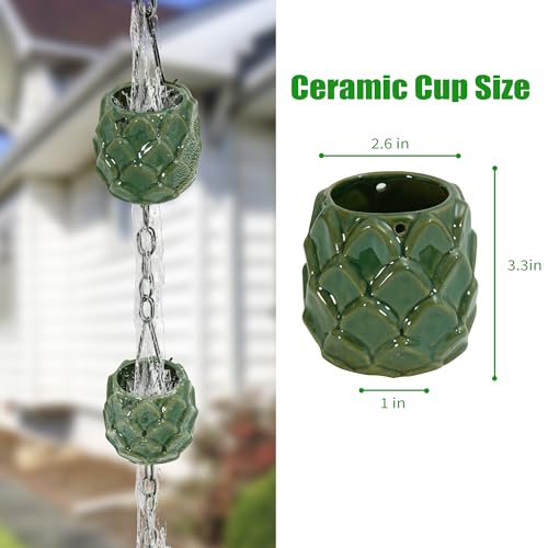 Rain Chains for Gutters, High-Value Porcelain Wide Cup Gutter Chain Downspout, 8-1/2 Feet Length Replacement Rain Chain Gutters, Green Succulent Appearance