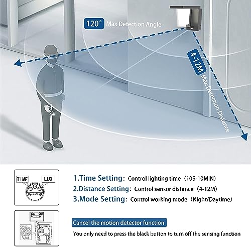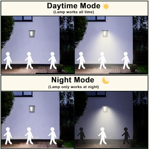 💡Motion Sensor Function: 1. This outside light will be Auto-on when its motion sensor detects someone passing by;2. You can set the sensor to work only at night or both day and night;3. You can set its sensor detection distance within 3-8m;4. If you don’t want to use sensor, you can set its off and use this lamp like normal item.