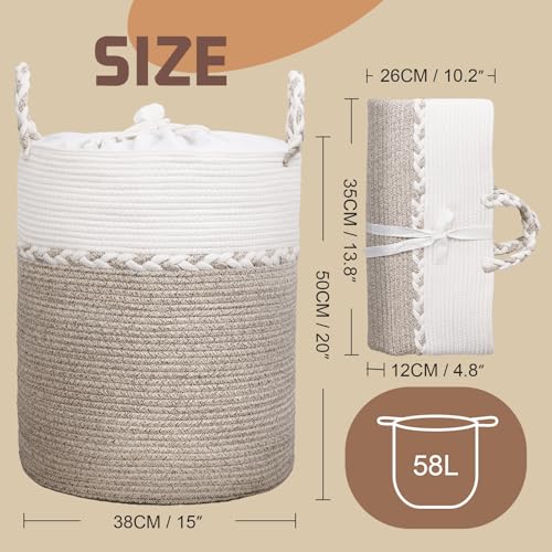 Autumnlife Cotton Rope Laundry Basket with Drawstring, Woven Toy Storage Blanket Baskets with Handle, Large Rope Basket Woven Storage for Cloths Diaper Blanket Toy Towel, White & Desert